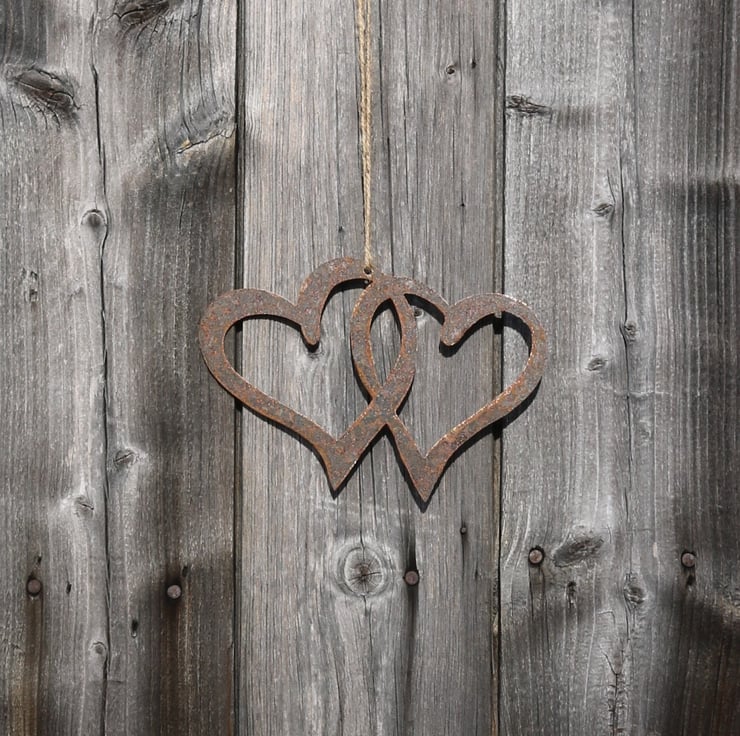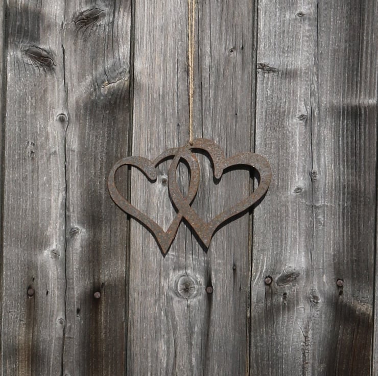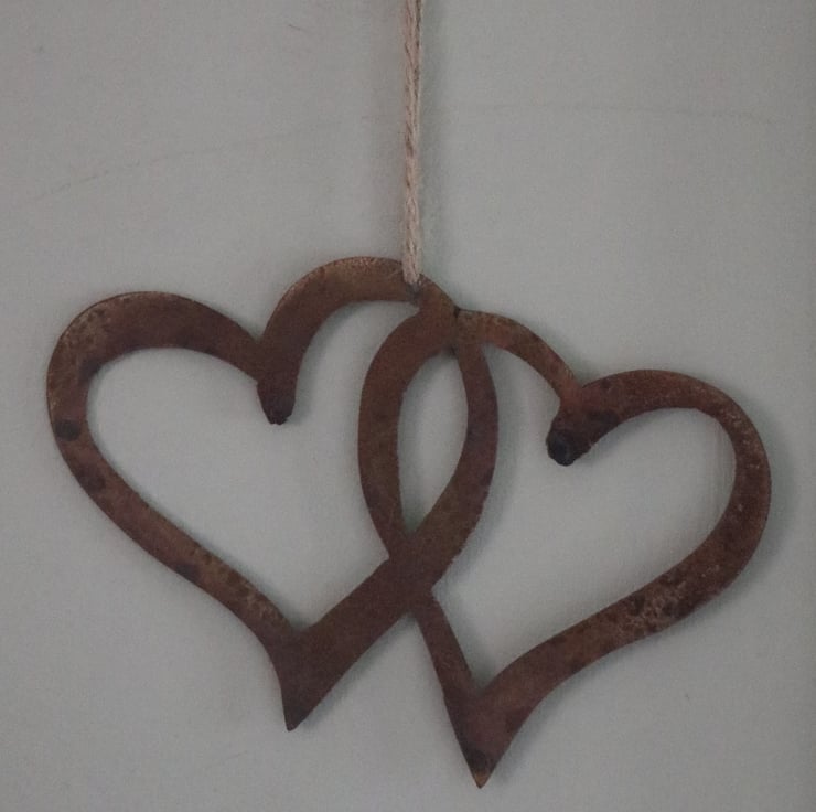 Bestseller - rusty metal hanging strung entwined hearts. Add all year round interest to your garden with our attractive rusty entwined hearts garden decoration. The mild steel is designed to weather naturally out in the elements, the beautiful rusty colours and textures will bring a truly organic feel to your garden. Also a perfect rustic decoration for the home. This item is hand finished so may vary slightly from the photograph. Dimensions:- hearts approx. 18cm x 13cm