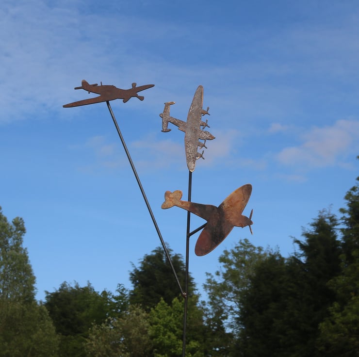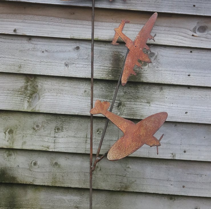 Also available with a 75cm extension pole (see separate listing) - NEW extended rusty metal garden art aviation gift for plane enthusiast - custom bespoke Lancaster, Spitfire and Hurricane plane garden art