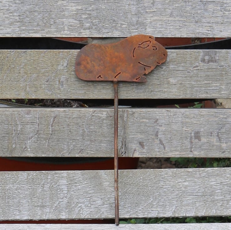 Rusty metal guinea pig plant pot decoration. Guinea pig approx 15cm wide x 8cm tall (overall size approx 29cm). Original bespoke guinea pig garden and outdoor gift, pet memorial gift.