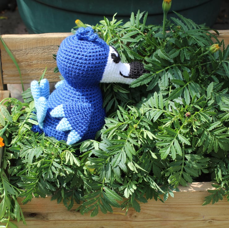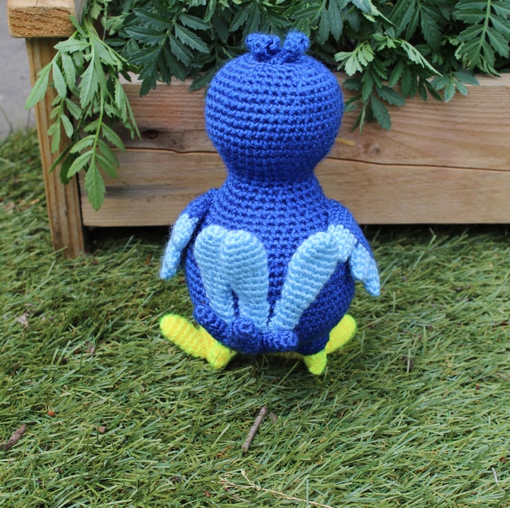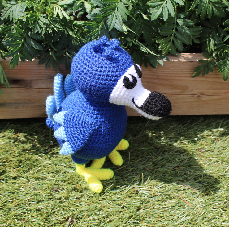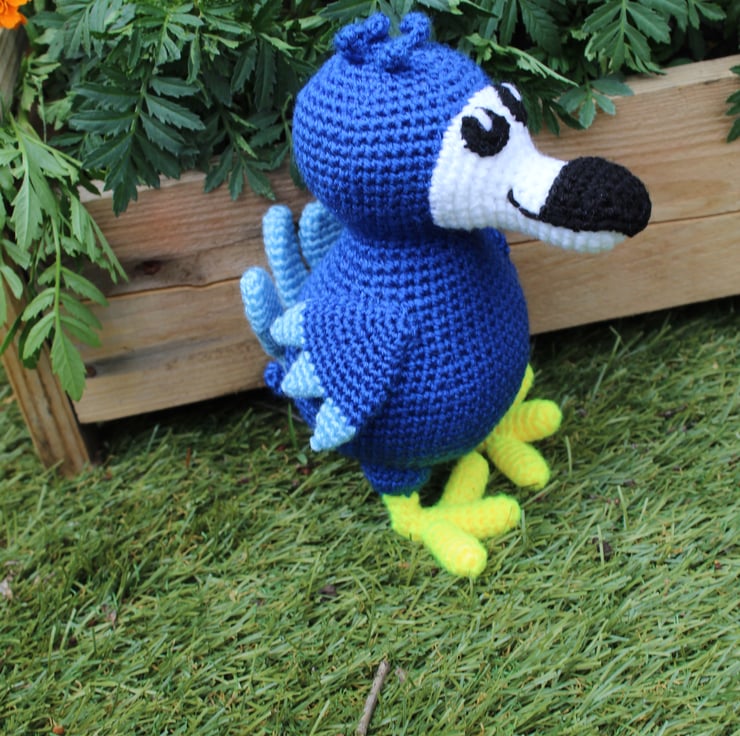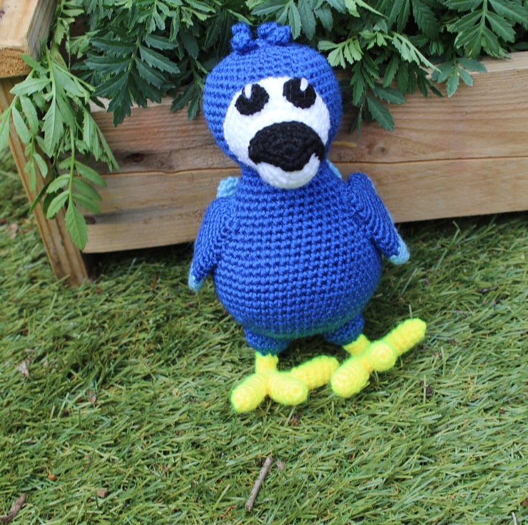Handmade crochet dodo. two tone blue. approximately 23cm tall. This dodo is ready for immediate dispatch. Other colours can be made to order. All items are UKCA and CE tested.