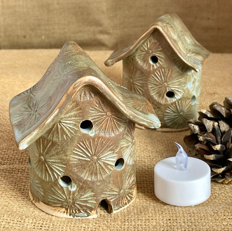 I make these in a variety of colours & textures, these houses feature a ceramic flower stamp I made myself for texture and have been fully glazed. Hand built from stoneware clay using slab method.