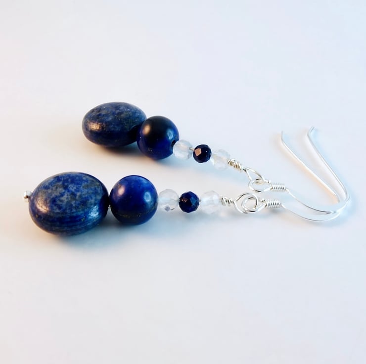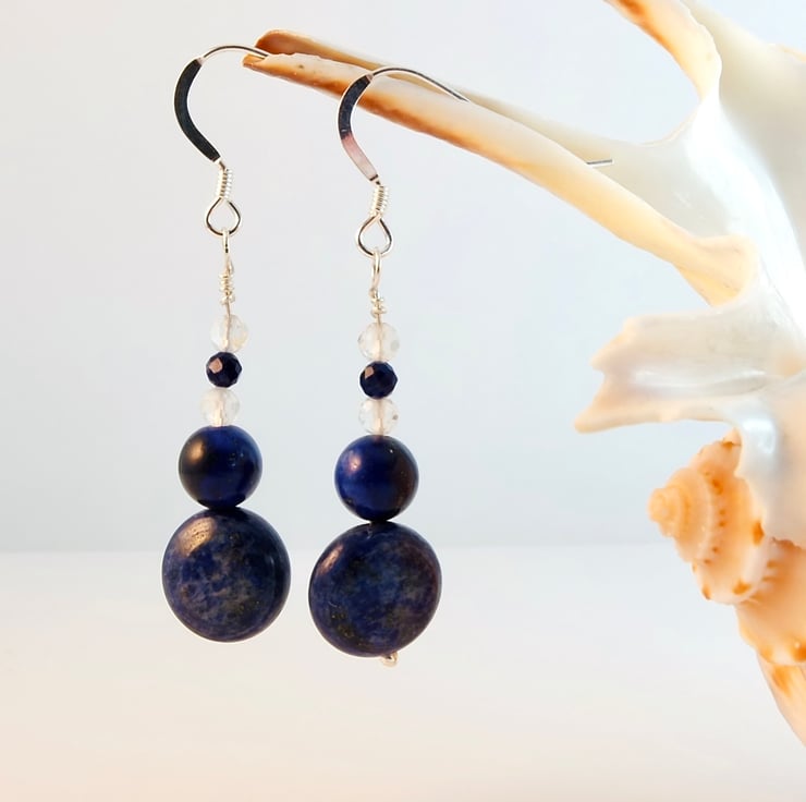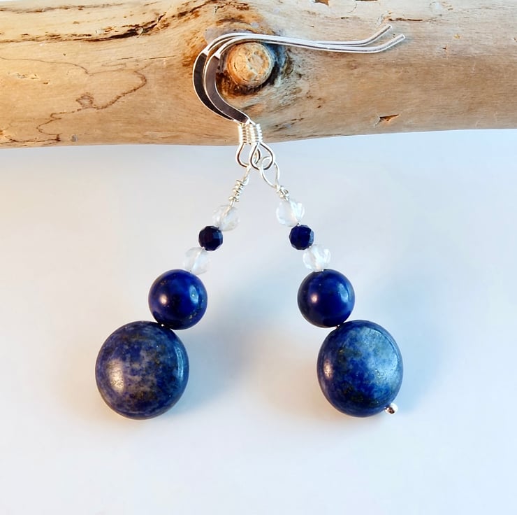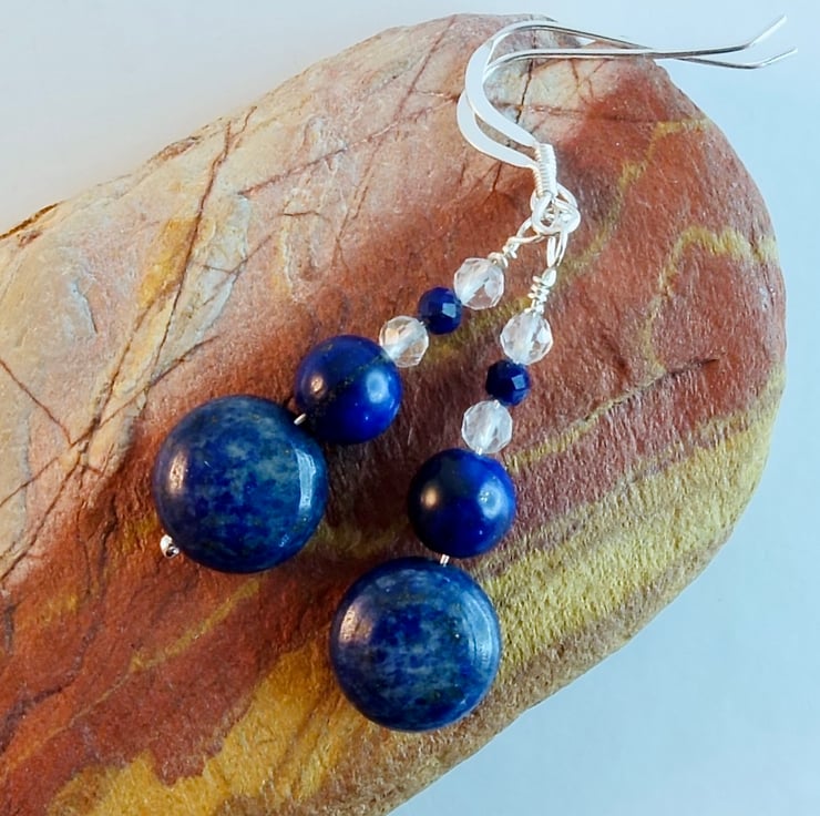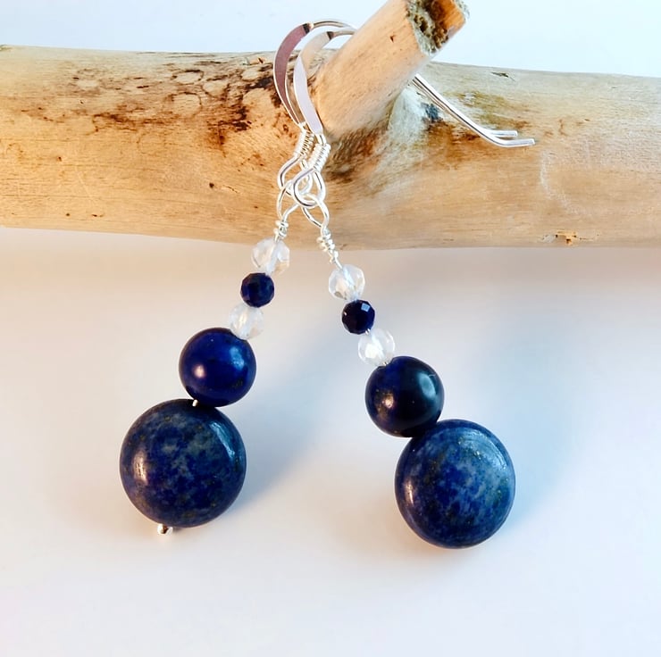 Lapis Lazuli Earrings With Crystal Quartz On Sterling Silver - Handmade In Devon
