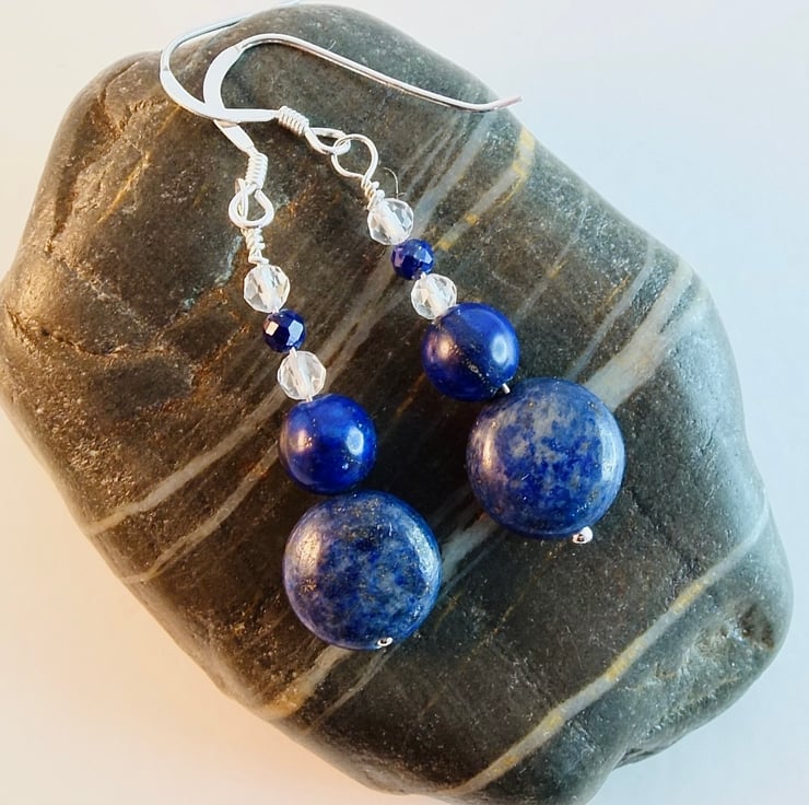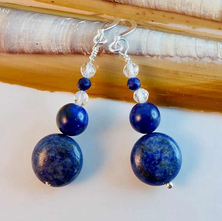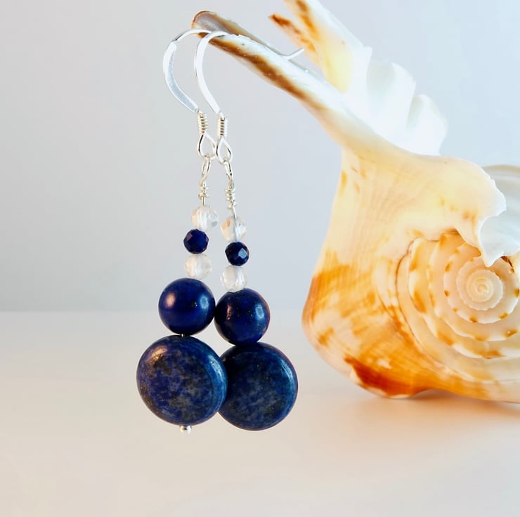 Each earring features a 10mm Lapis Lazuli puffy coin bead, topped with a 6mm Lapis round, and two 3mm AAA grade faceted crystal Quartz beads separated by a 2.75mm AA grade faceted Lapis Lazuli bead.