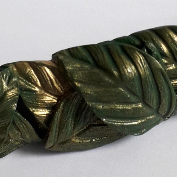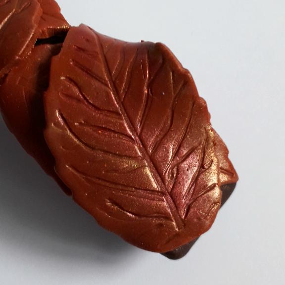 I have covered the metal blanks with polymer clay, then added the leaves on top, the copper leaves have been brushed with red and gold mica powders and the green with gold, then both are lightly varnished to highlight the colours.