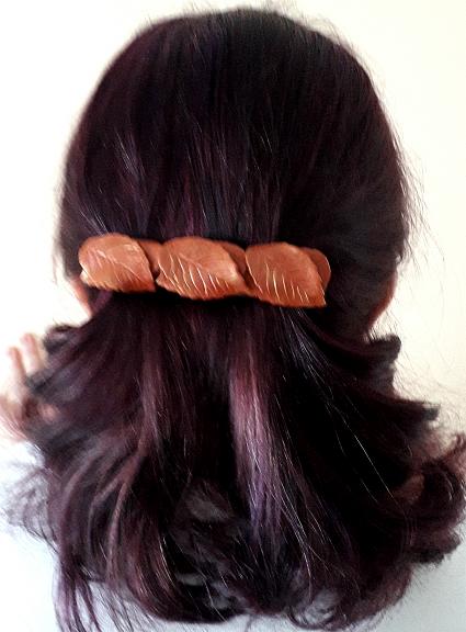 These barrettes are available in copper or green and in two sizes, the smaller ones are 8cm x 1.5cm, the larger ones are 11cm x 2cm, you can make your choice in the options box at checkout.