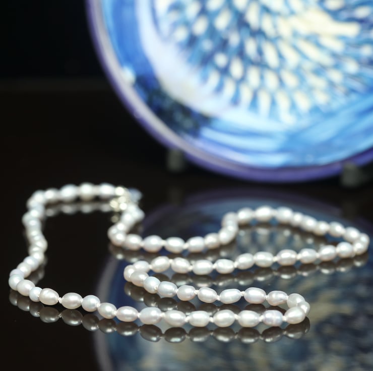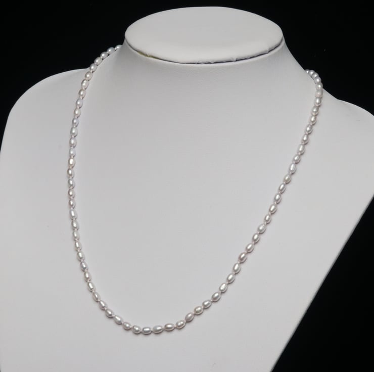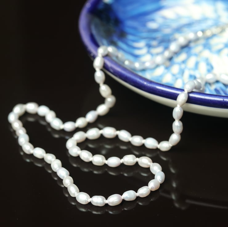 Rice pearls are elongated freshwater pearls, often with a crinkled or ringed surface. These particular pearls have a fairly smooth surface although some of them are of better lustre than others. The pearls are quite tiny: each 3.5 – 4mm long. I have strung them on silk: the traditional medium, and have knotted between each pearl, an old-fashioned technique that ensures a good drape and also security in the unlikely event that the silk breaks.