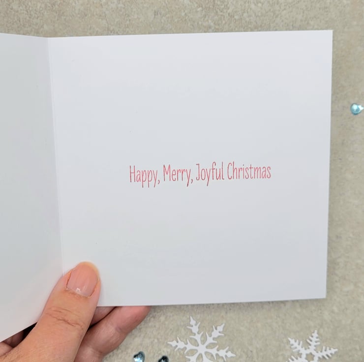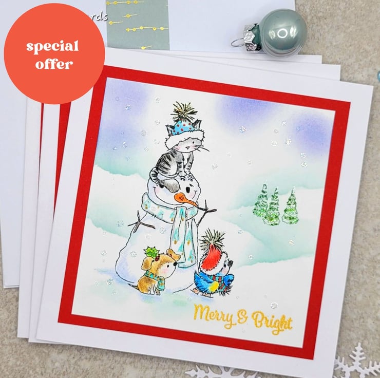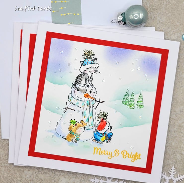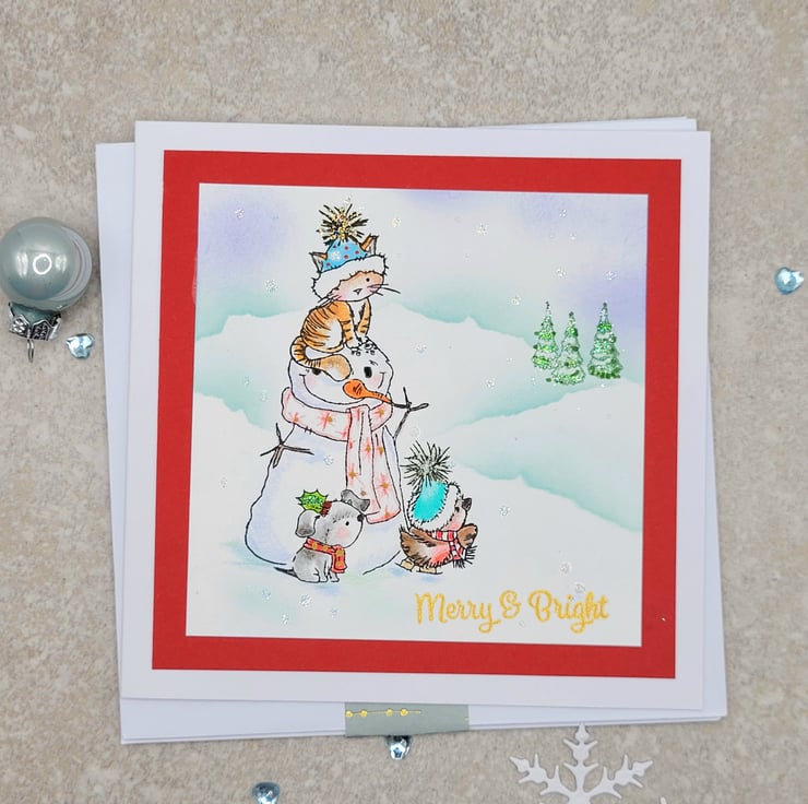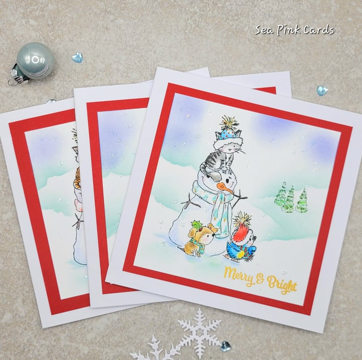 Three individually handmade Christmas Cards, with an adorable snowman and his friends! They certainly have the awwww factor! I have designed and made this lovely little set of cards by hand, in my craft room. Each card is 12.5 x 12.5 cm and is coloured using Arteza Expert Pencils and Windsor and Newton ProBrush Markers. This creates an attractive soft finish which you won't find with mass produced cards. Small touches of water-based non-shedding glitter glue add some Christmas Sparkle! The list price is for the 3 cards.