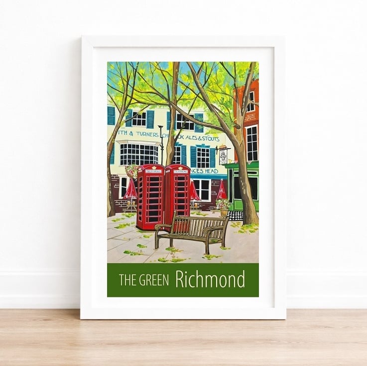 A lovely travel poster print of The Green, Richmond, Surrey, including the Prince's Head, famous as the Crown & Anchor in TV series "Ted Lasso", from my own original acrylic painting. A perfect gift for those who love Richmond!