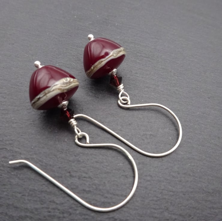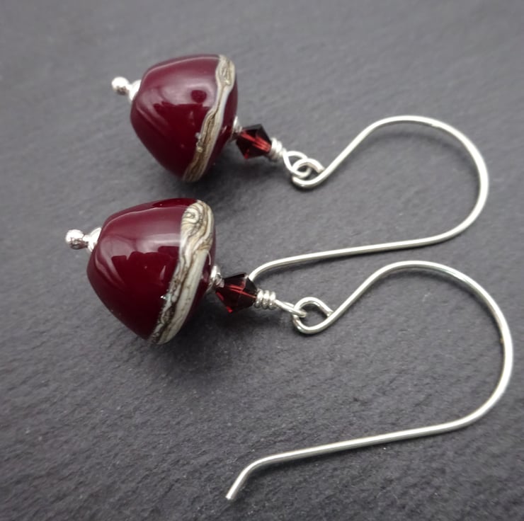 A pair of earrings made with handmade sterling silver ear wires, sterling silver beads, red swarovski crystals and handmade lampwork glass beads.