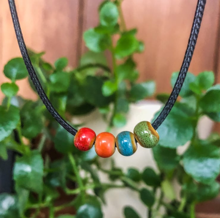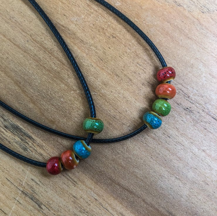 These necklaces have orange, blue, red and green beads. There is slight variation in shades of these colours due to the uniqueness of the ceramic beads. You can find other colour combinations on my shop page!