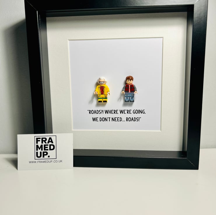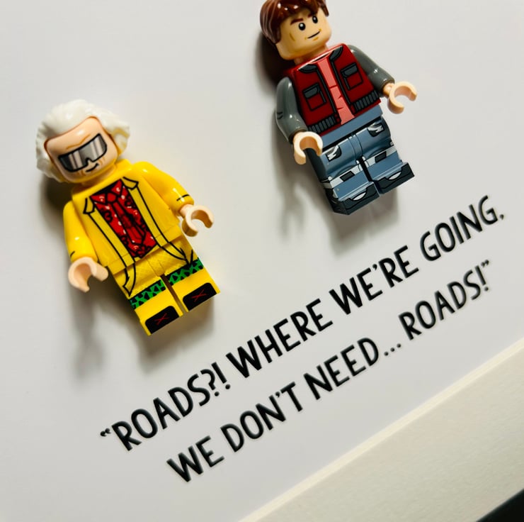 Some movies deserve a sequel and this frame represents one of the best sequels we have ever seen… Back to the Future II. We have mounted a minifigure of Doc Brown and one of Marty McFly from the second movie, this time showing my two favourite characters in their 2015 outfits - the future. These two are teamed along with the classic quote “Roads…”