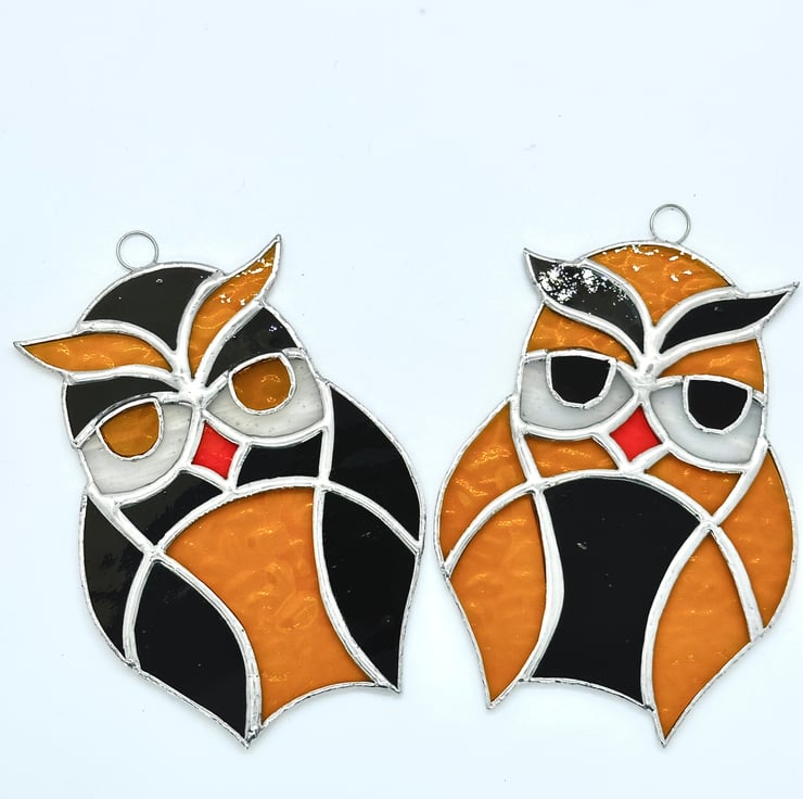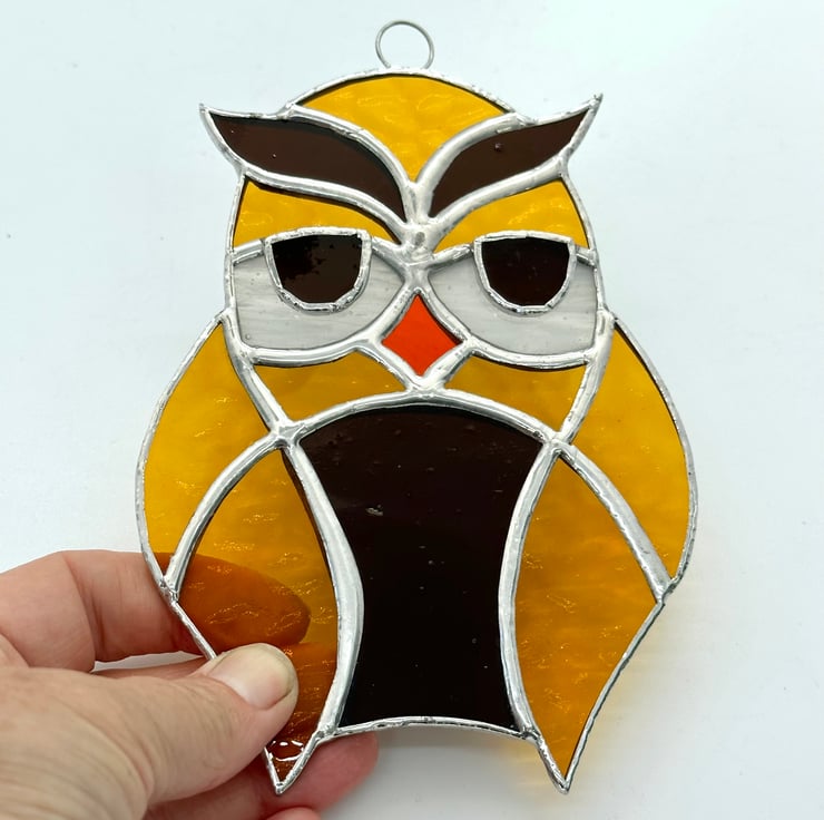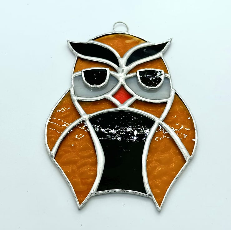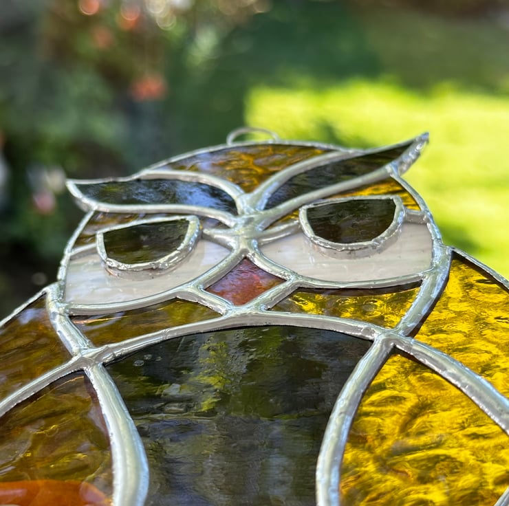 Each piece of glass has been cut by hand, ground to remove any sharp edges, washed foiled and soldered together. I have overlayed the eyes onto if the white glass which give a 3D effect. A ring has been attached for hanging purposes.