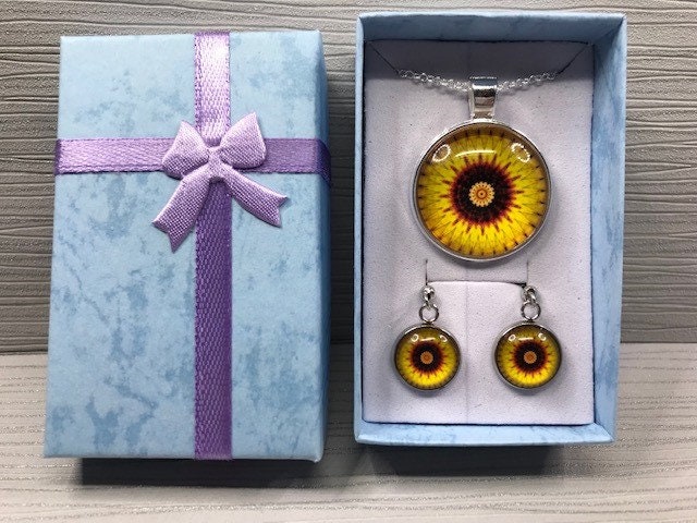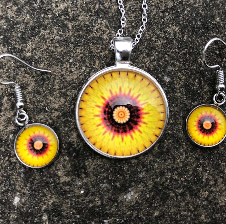 The pendant itself has a silver backing and the beautiful pattern sits within a glass dome. It is 25mm in diameter.