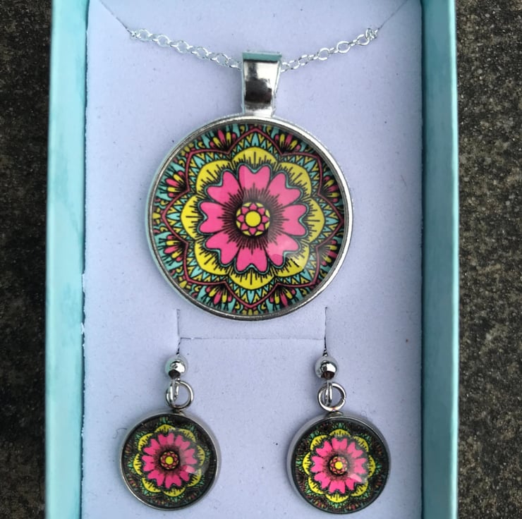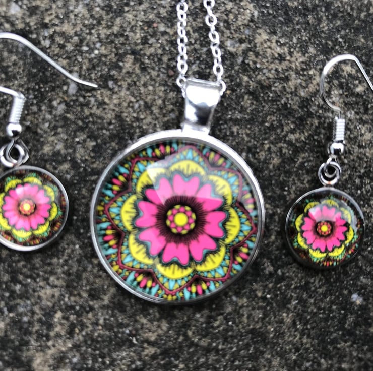 The pendant itself has a silver backing and the beautiful pattern sits within a glass dome. It is 25mm in diameter.