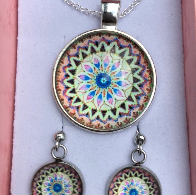 The pendant itself has a silver backing and the beautiful pattern sits within a glass dome. It is 25mm in diameter.