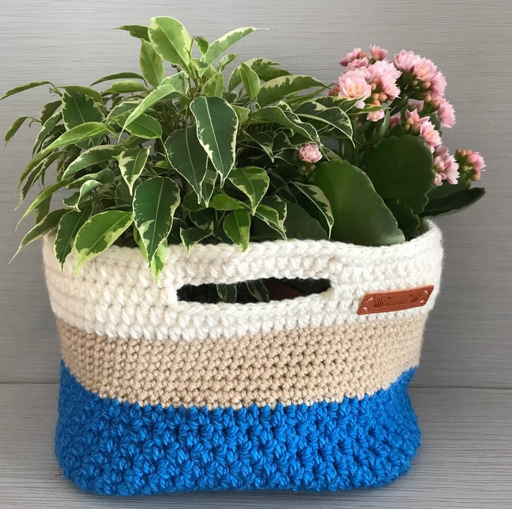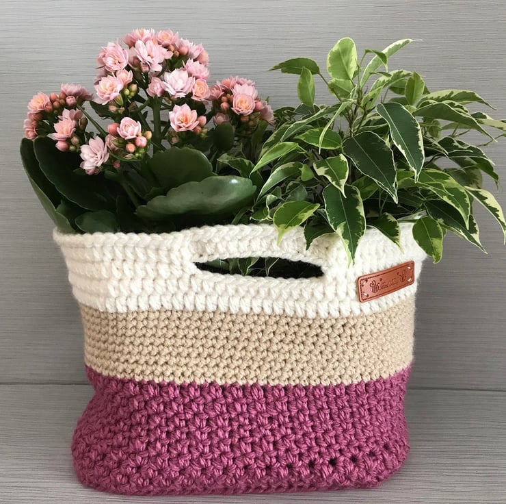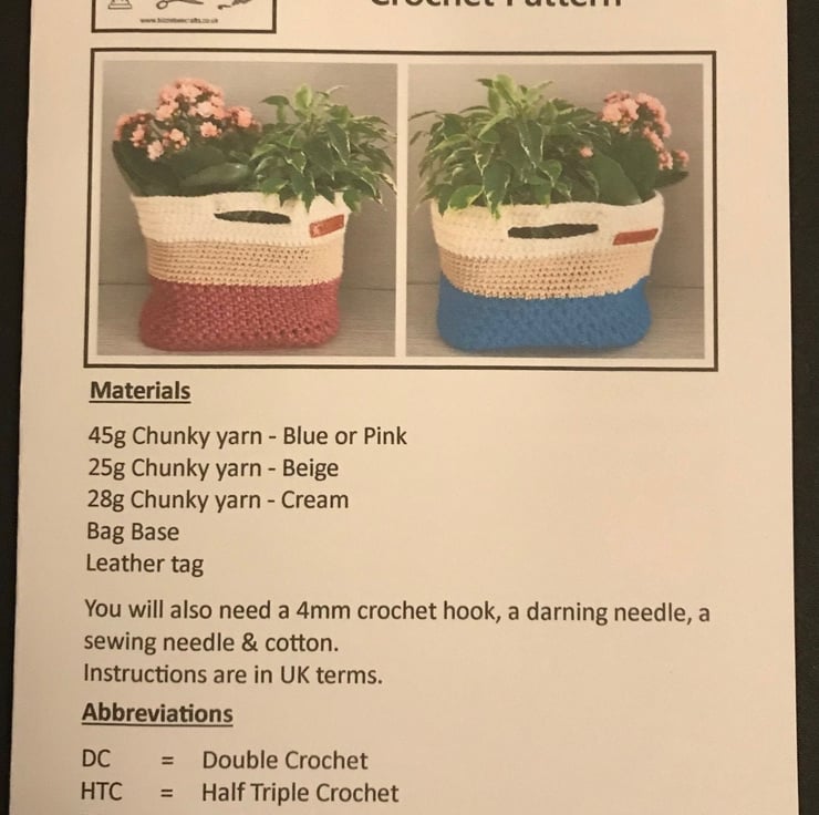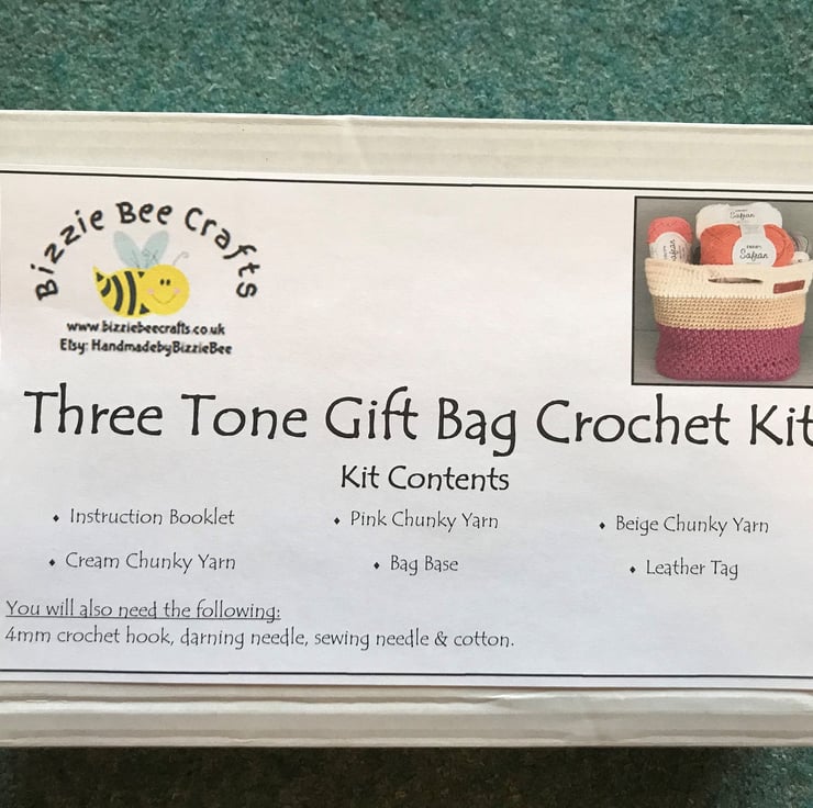 This is a kit, suitable for those fairly new to crochet, which will enable you to make a lovely three toned gift bag / basket.