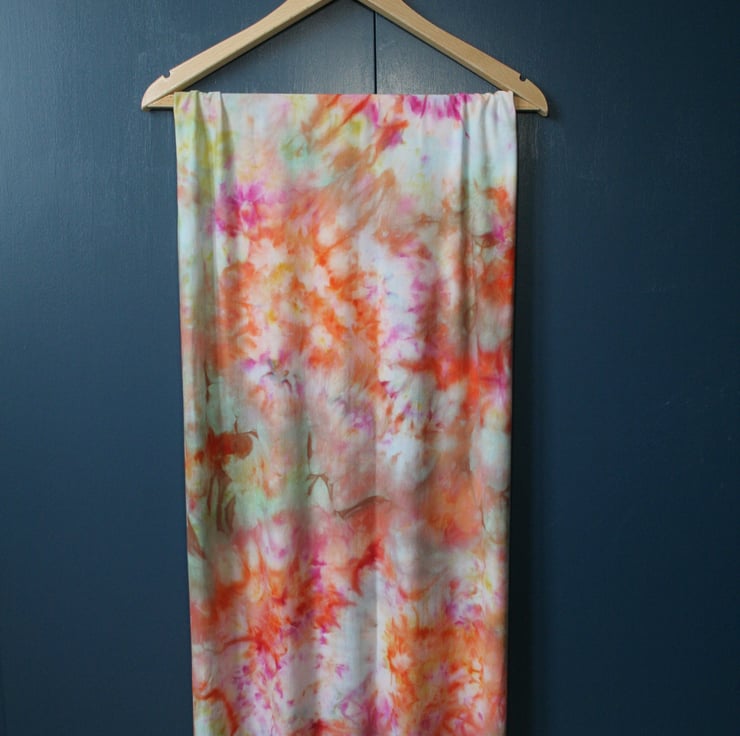 Handmade scarf in a sustainable bamboo jersey, ice dyed using a range of bright summer colours. Beautifully soft and a great sustainable option to brighten up your wardrobe, perfect for spring / autumn.