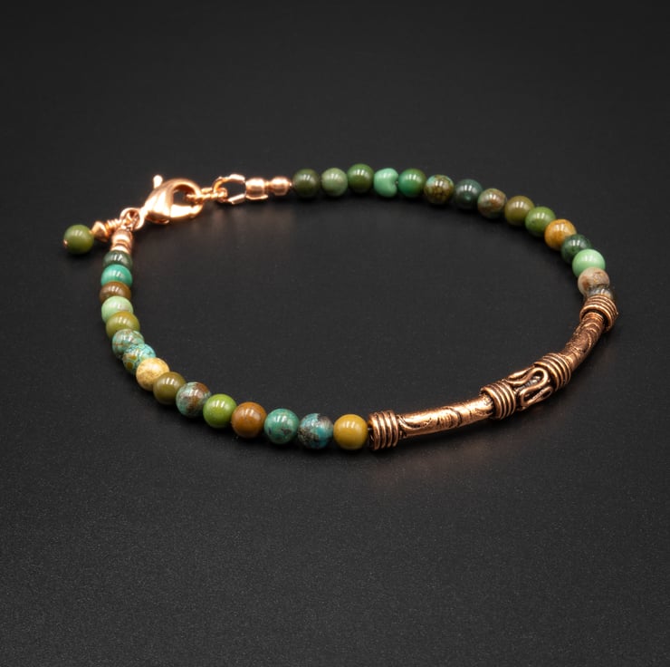 10mm round beads of gorgeous natural turquoise are mixed with antique copper tone spacers and a twisted copper ring for these handmade copper earring drops.