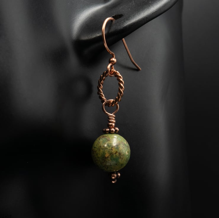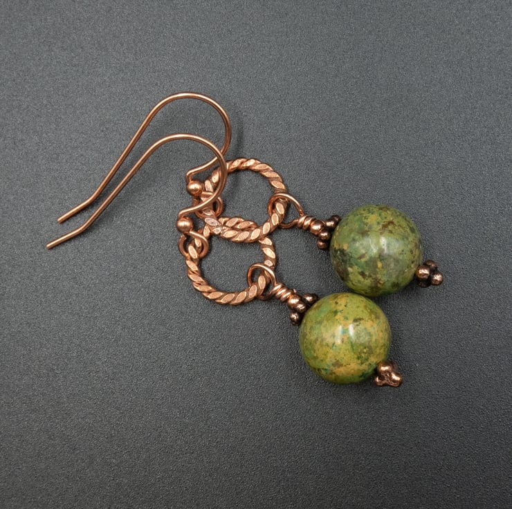 10mm round beads of gorgeous natural turquoise are mixed with antique copper tone spacers and a twisted copper ring for these handmade copper earring drops.