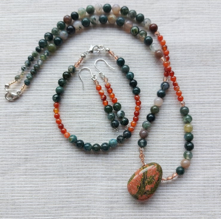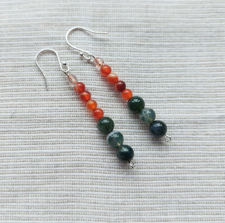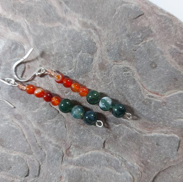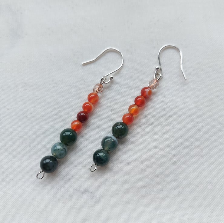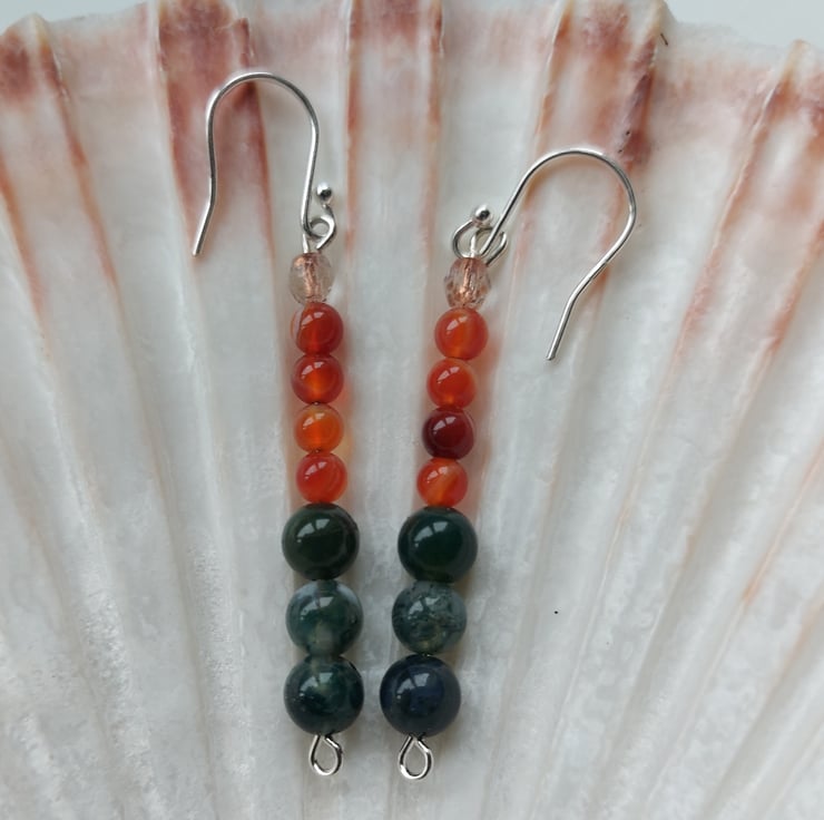 I made these colourful earrings as part of a jewellery set to celebrate vibrant autumn colours. I have used 6mm beads of forest green moss agate and 4mm beads of orange-red carnelian, plus copper-lined crystal beads for a touch of sparkle. The headpins and ear hooks are sterling silver. The drop below the hook is 4cm, 11/2inches. The earrings may be bought on their own or as part of the three piece set (see last photo). This will appear at a discount price in the 'Jewellery Sets' collection in my Folksy shop.