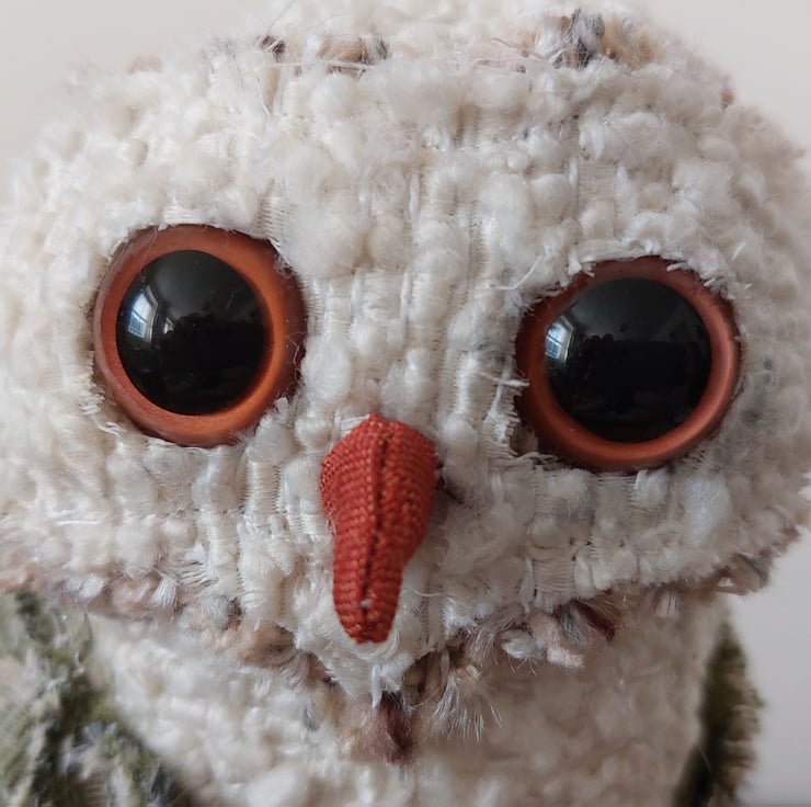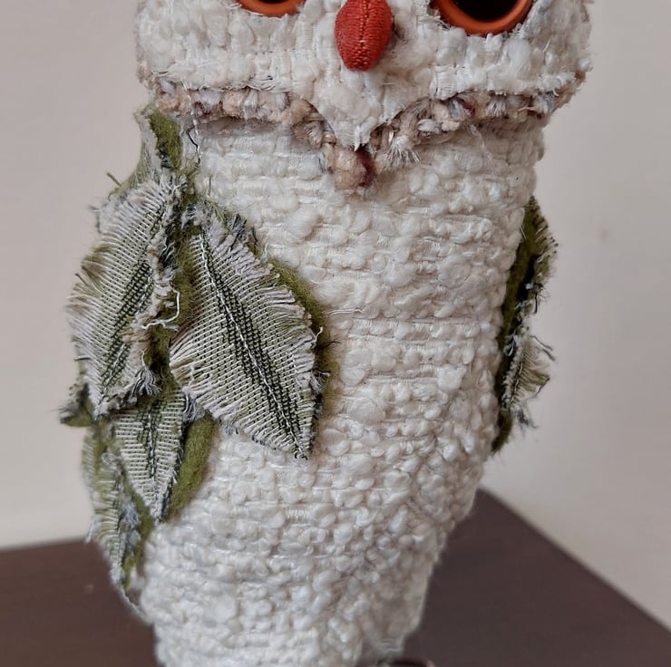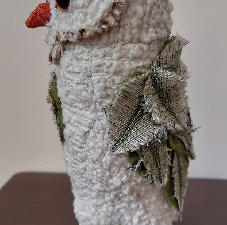 This quirky textile owl sculpture has been hand crafted using fabric remnants and other recycled materials. Freestanding approx 18cm in height. Please note that this is not a toy.