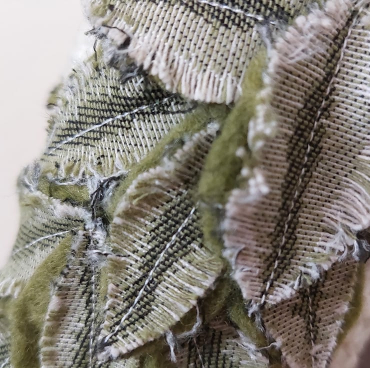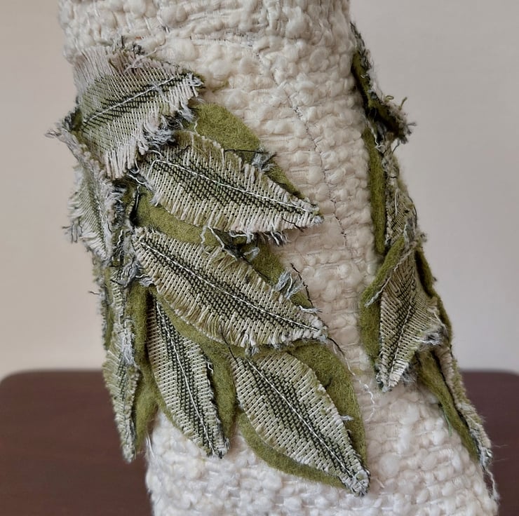 This is Fagus. His main body is made from fabric taken from an obsolete sample book given to me by a local furniture store. I really enjoyed playing with colour, pattern and texture with the remnant used to make his plummage. I think they look like beech leaves - hence his name.