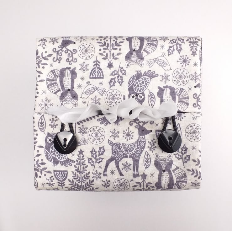 Holiday themed winter forest scene with foxes, deer, owls, and birds, and solid grey base, and solid black lining. Pattern placement varies