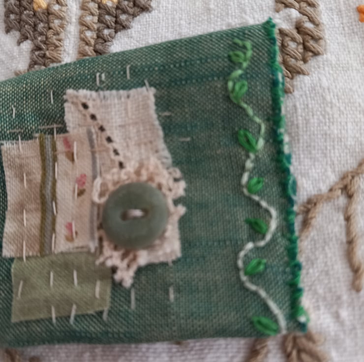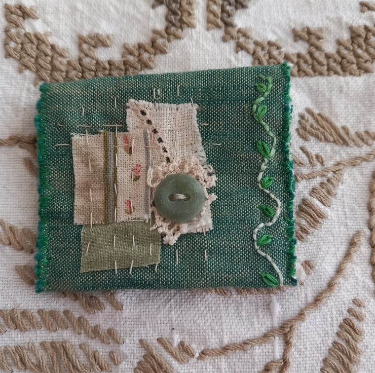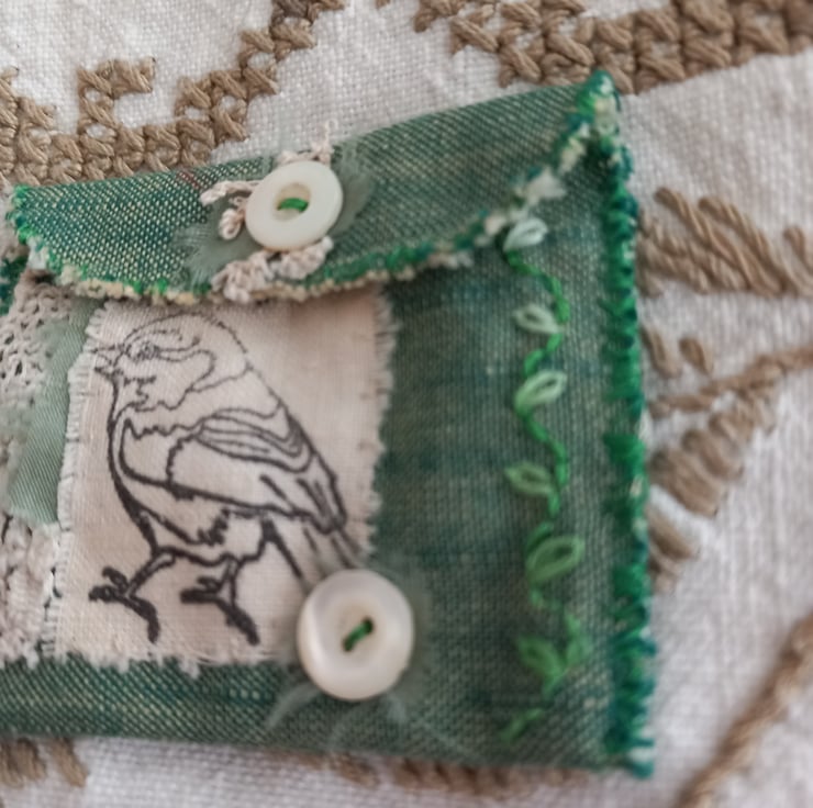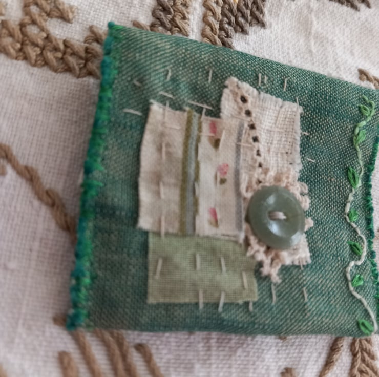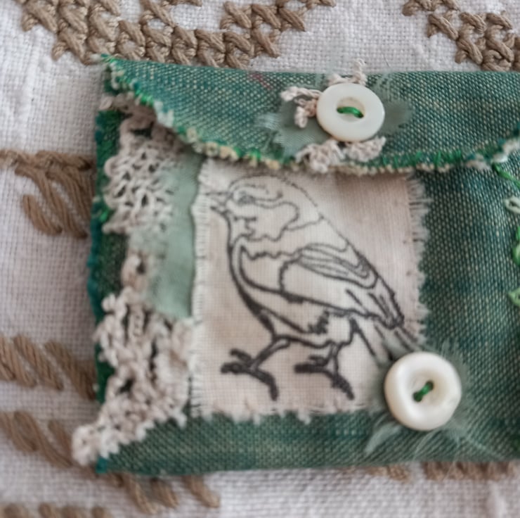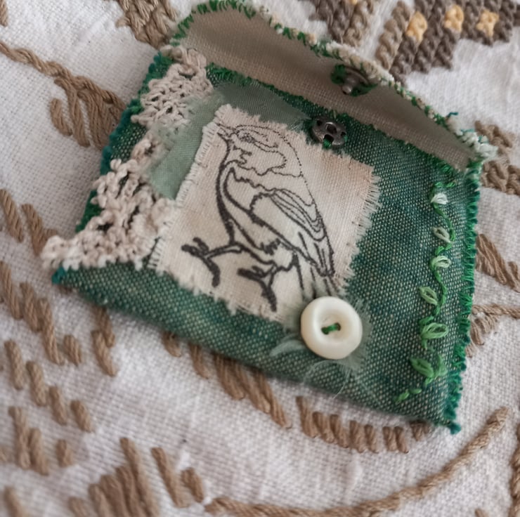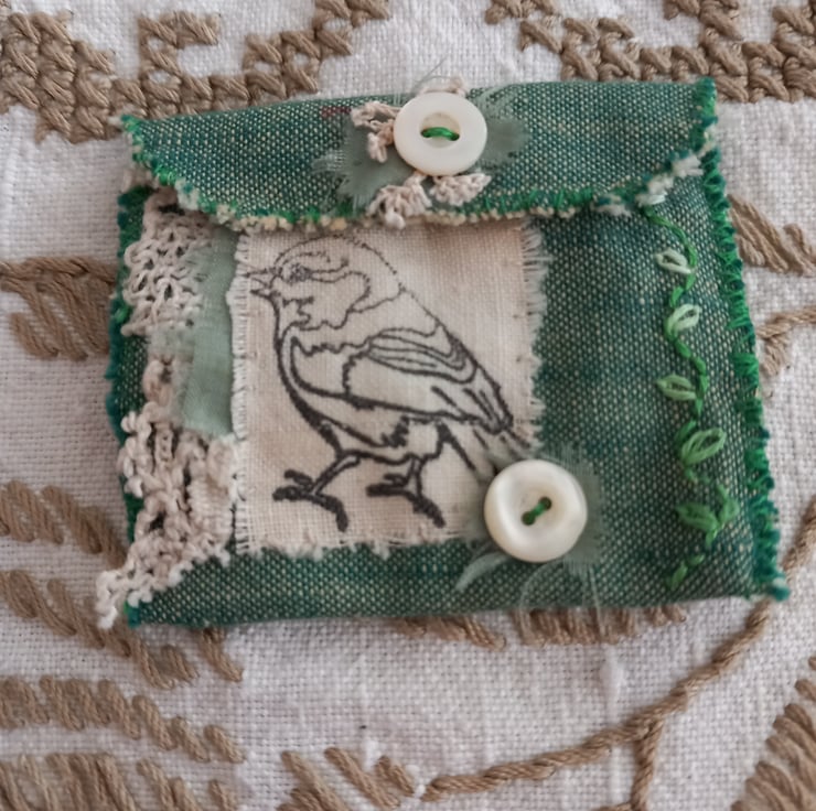 This little pouch has been hand-stitched from a scrap of green linen fabric and decorated with a stamped patch and embroidery. It has a press stud closure.
