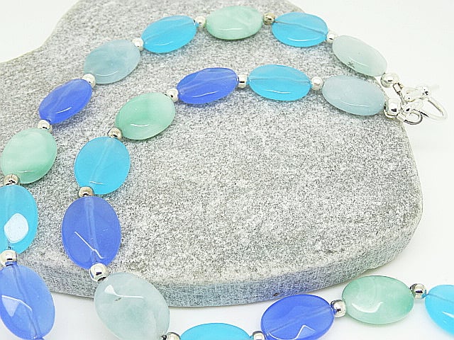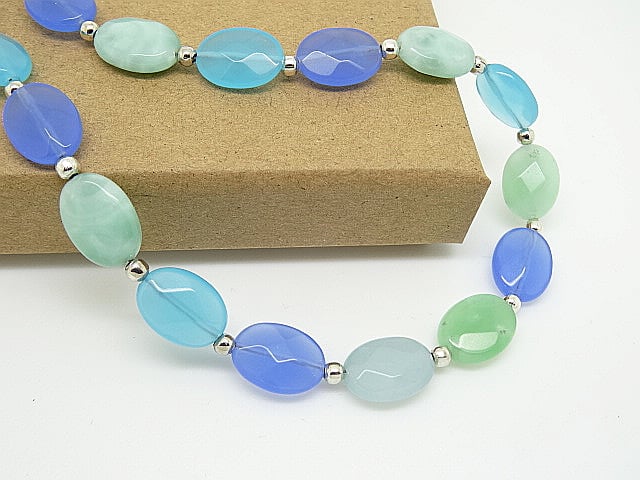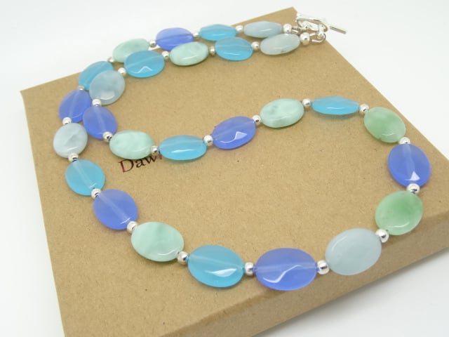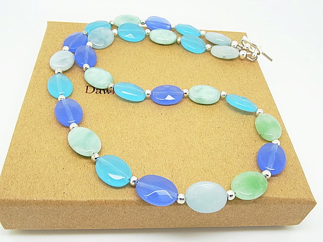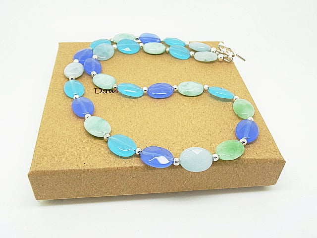 This is such a pretty necklace, although simple in design it looks very striking when wearing. I have made this using 10 x 14mm high quality faceted Green Moss Quartz oval beads they have a sparkly shine because of the facets. The colours are perfectly pastel including greens, and blues, these are interspersed with small round, silver plated spacer beads. The necklace measures 18.5 inches (47cm) and closes with a silver plated toggle clasp.