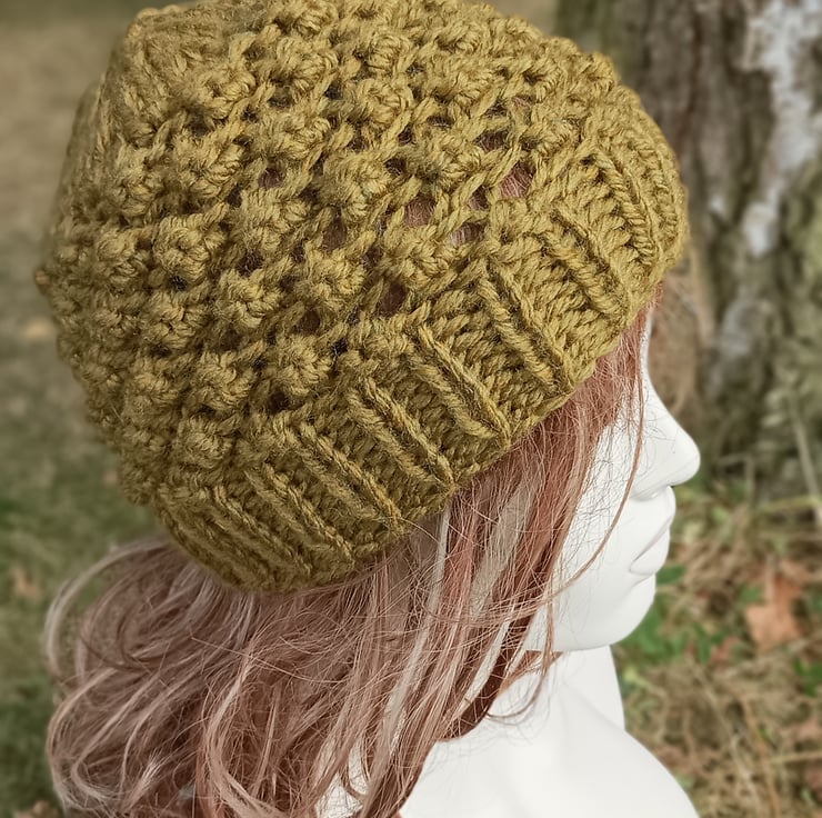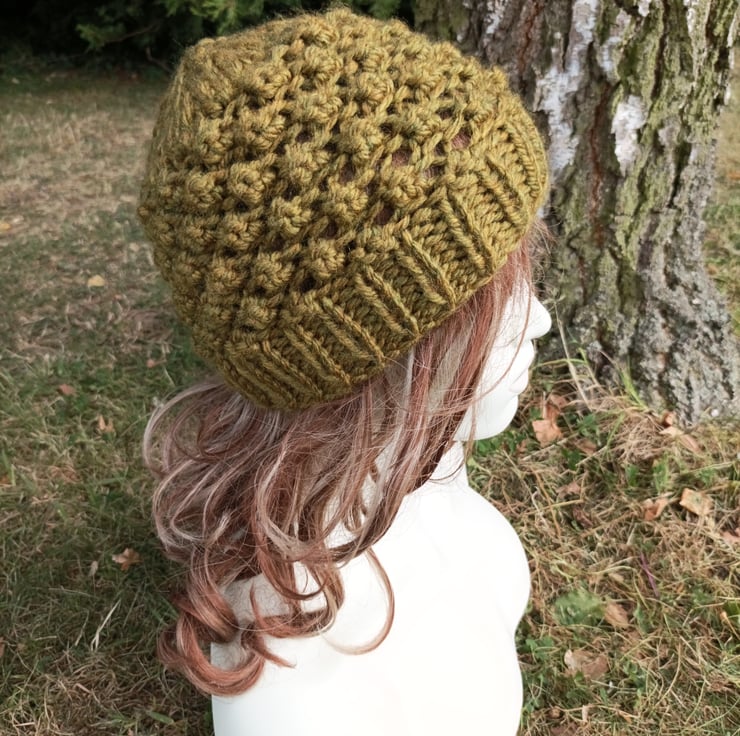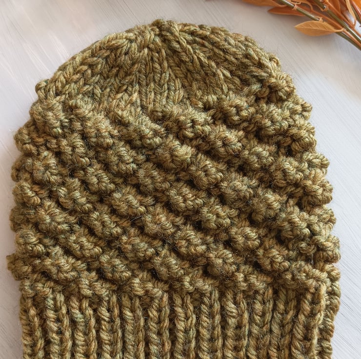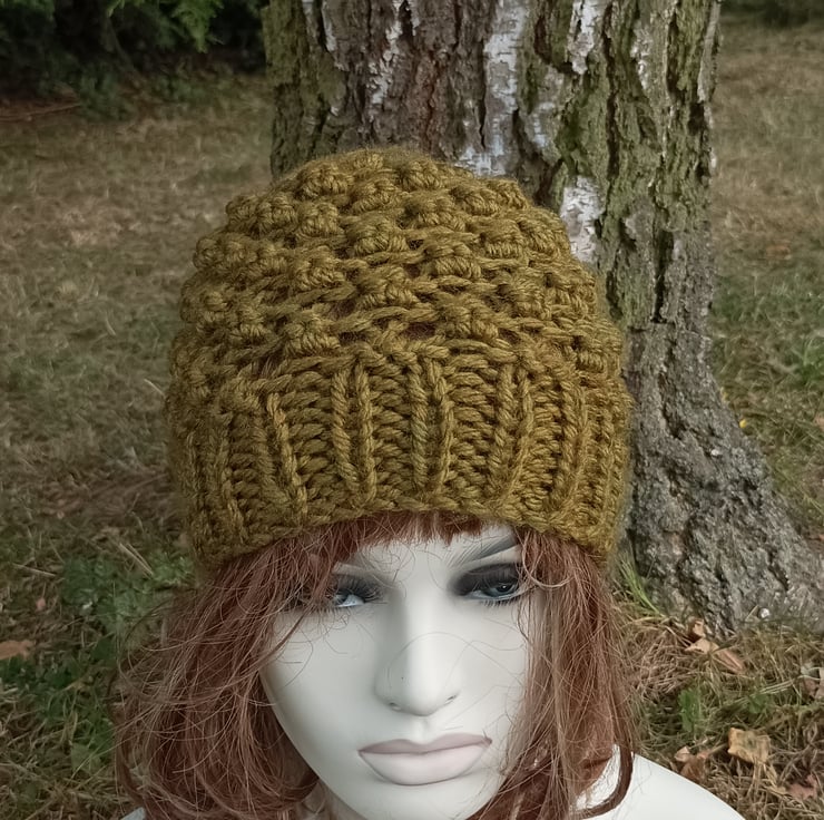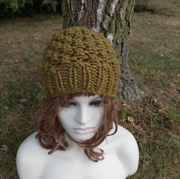 New design for this winter. Lovely super chunky knit ladies hat. Knitted in a lovely olive shade which has subtle undertones to it.