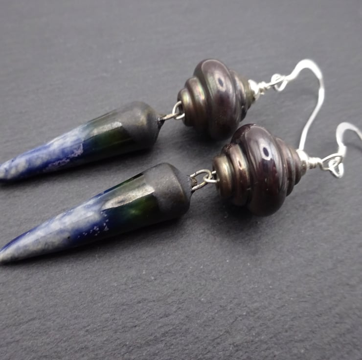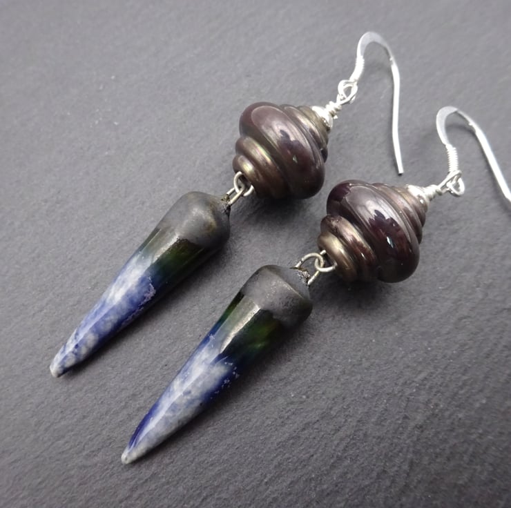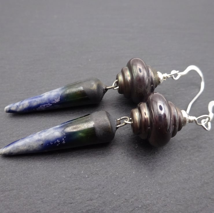 A pair of earrings made with sterling silver ear wires, handmade lampwork glass beads and handmade ceramic spikes with a blue glaze.