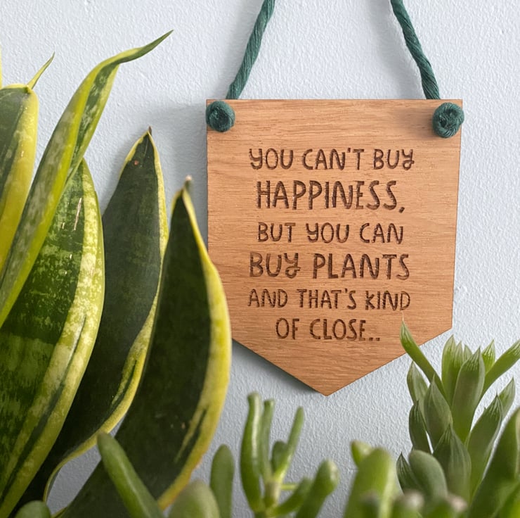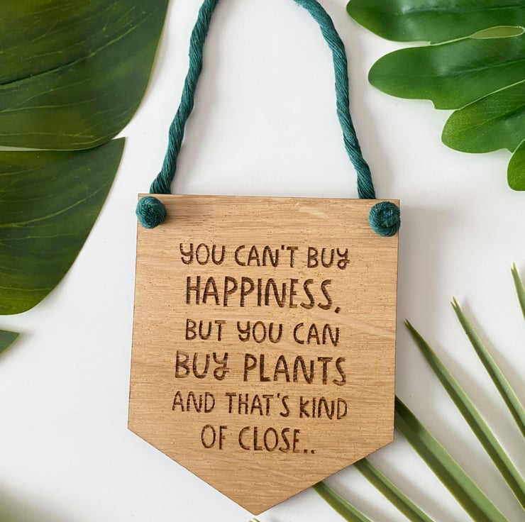 Nurture the plant mum in you. Add personality to your living space with a cheerful oak wooden wall hanging banner with a motivational quote saying: You can't buy happiness, but you can buy plants and that's kind of close.