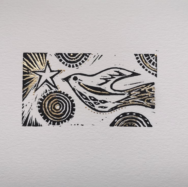Hand pulled lino print depicting a songbird in a starry sky. The gilded design has elements added once the print has dried.