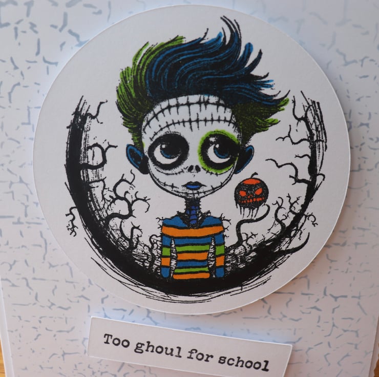 This card is blank inside and the sentiment on the front is ( Too ghoul for school ) Distress inks and alcohol ink I used to colour this.