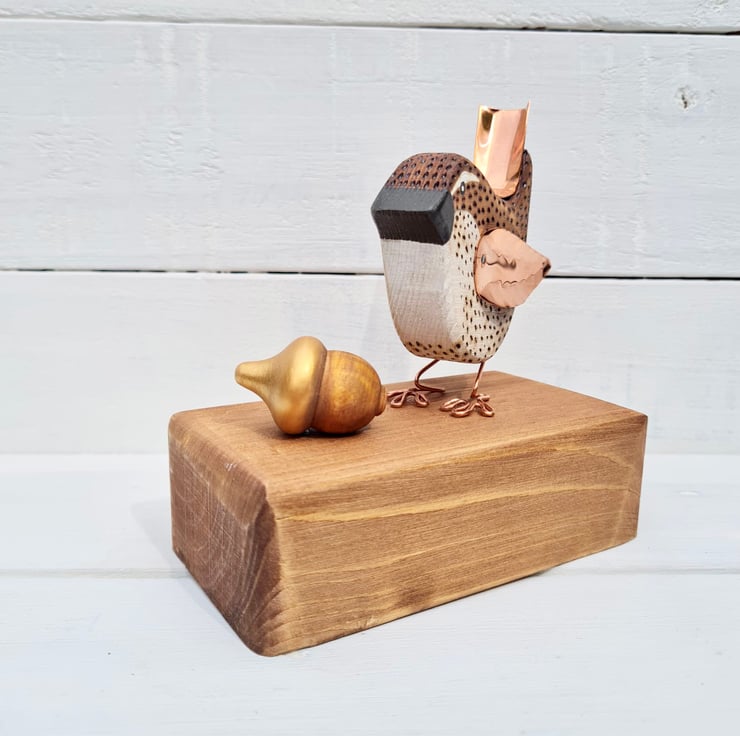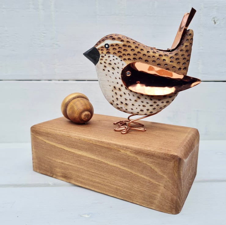 Hand crafted wooden Wren with copper coloured metal wings and wire feet. Mounted on a wooden plinth with a wooden ‘acorn’