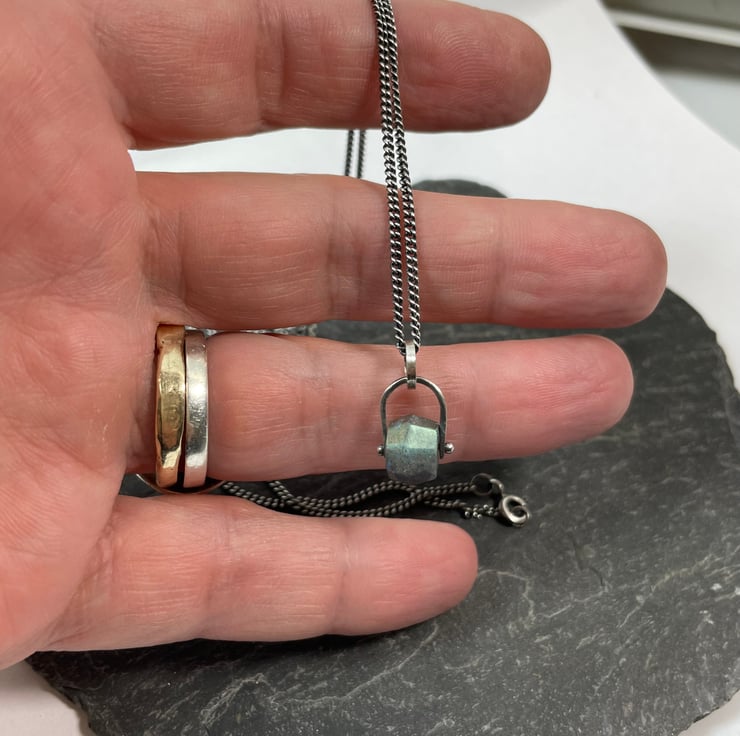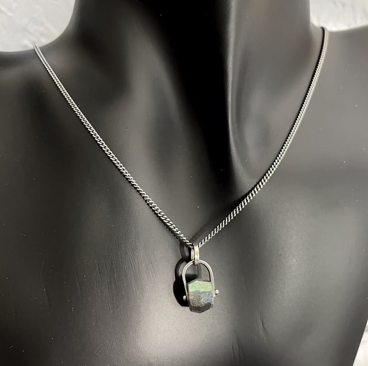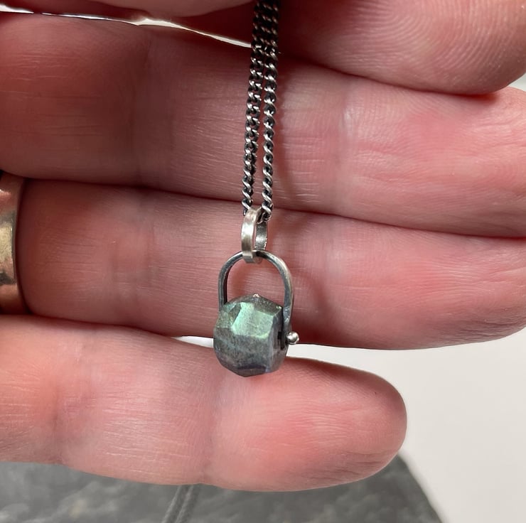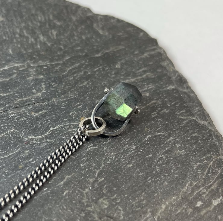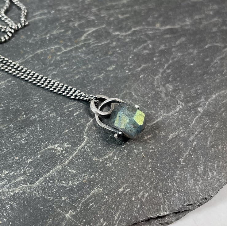 A flashy faceted labradorite bead is held in an oxidised silver bail. Hung on an oxidised silver curb chain.