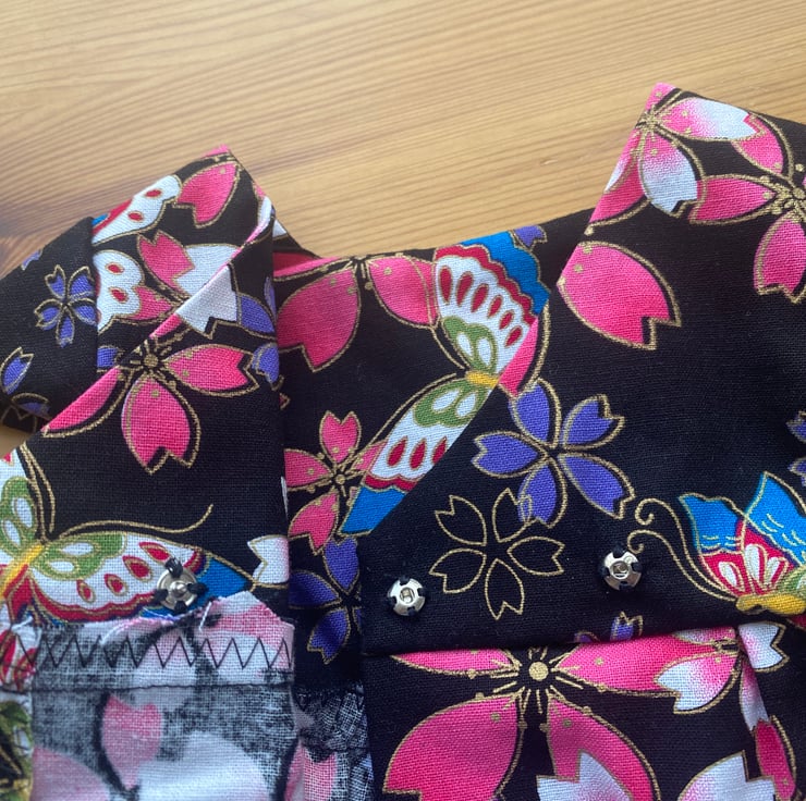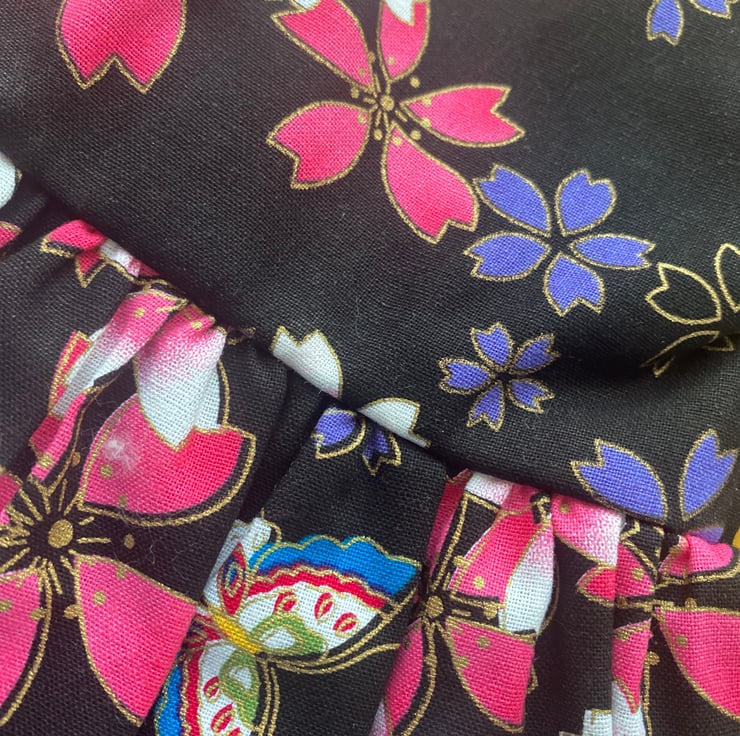Dolls wrap style dress, the main colour is black which sets off the other colours in the dress. Pink, lilac, turquoise etc. the flowers, leaves and butterflies are outlined in a metallic gold. Which gives the fabric a bit of shimmer.