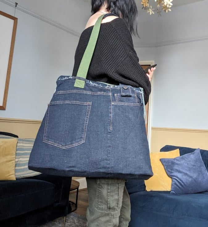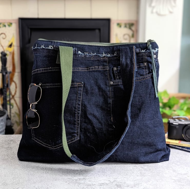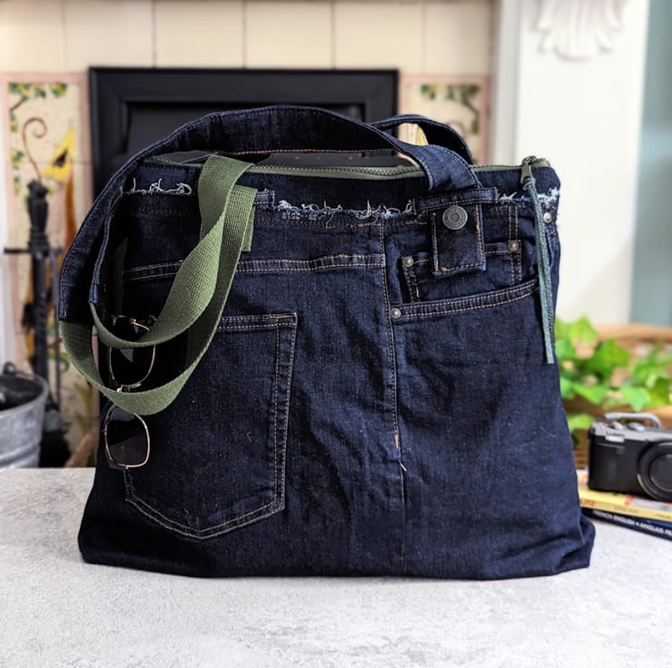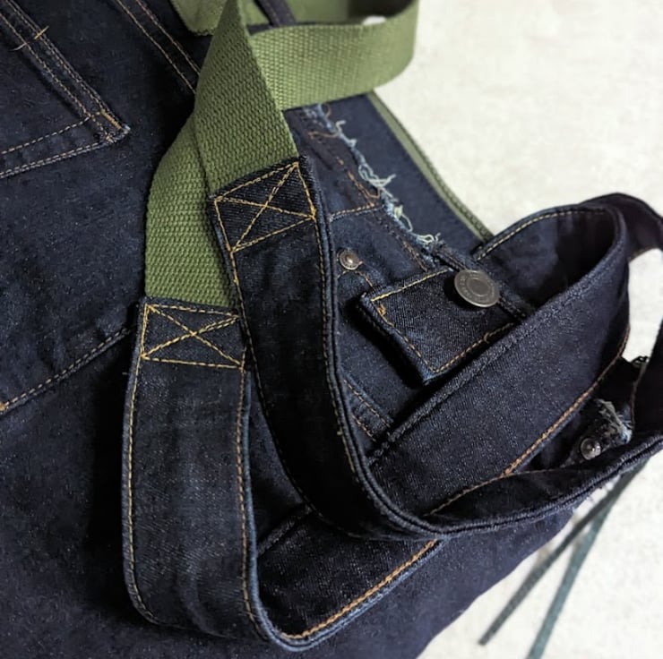 The shoulder straps are made from the waistband of the jeans with the addition of olive green webbing. Handles approx: drop 37cm, length 75cm