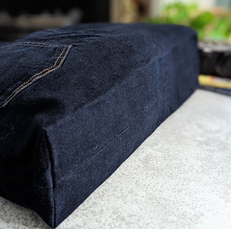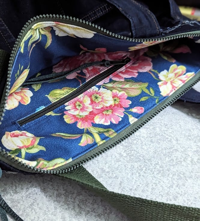 Oversized and eco-conscious. A super roomy, zipped shoulder tote bag that's been handmade using recycled, pre-loved dark indigo denim jeans with a floral heavy weight cotton fabric lining. Using lots of features from the original jeans and olive green detailing.