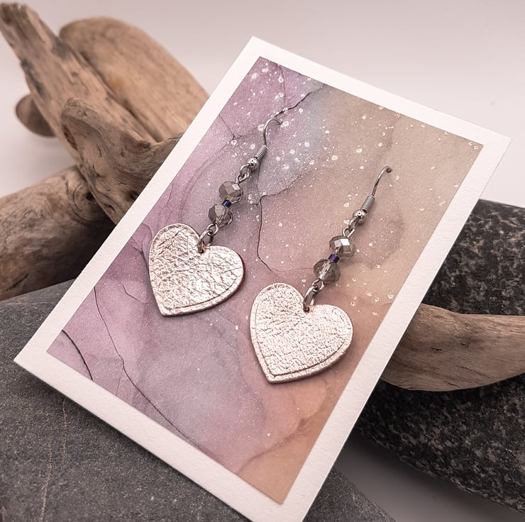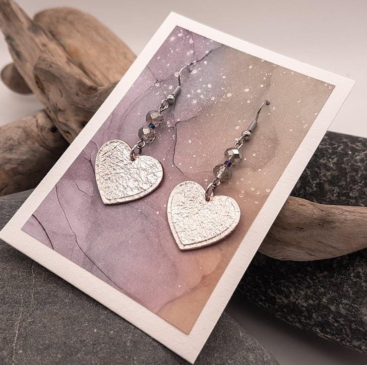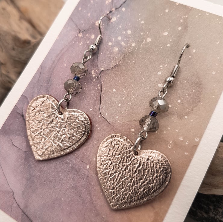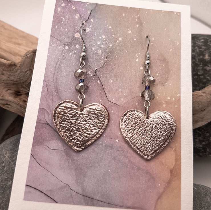 A pair of 'heart' shaped leather earrings with rondelle glass crystal beads. The leather hearts measure 2cm and are medium brown one side and rose gold metallic the other. The leather can be either way, with just a flash of metallic if on the back, or full on at the front, the choice is yours, just let us know and we can reverse them for you. All ear wires are surgical steel.