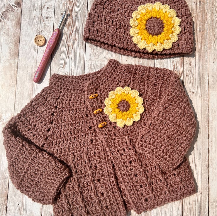 0-3 month crochet cardigan and hat set, with sunflower appliqué on the cardigan and hat.