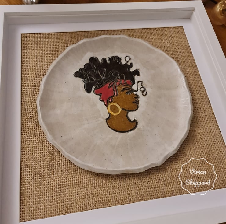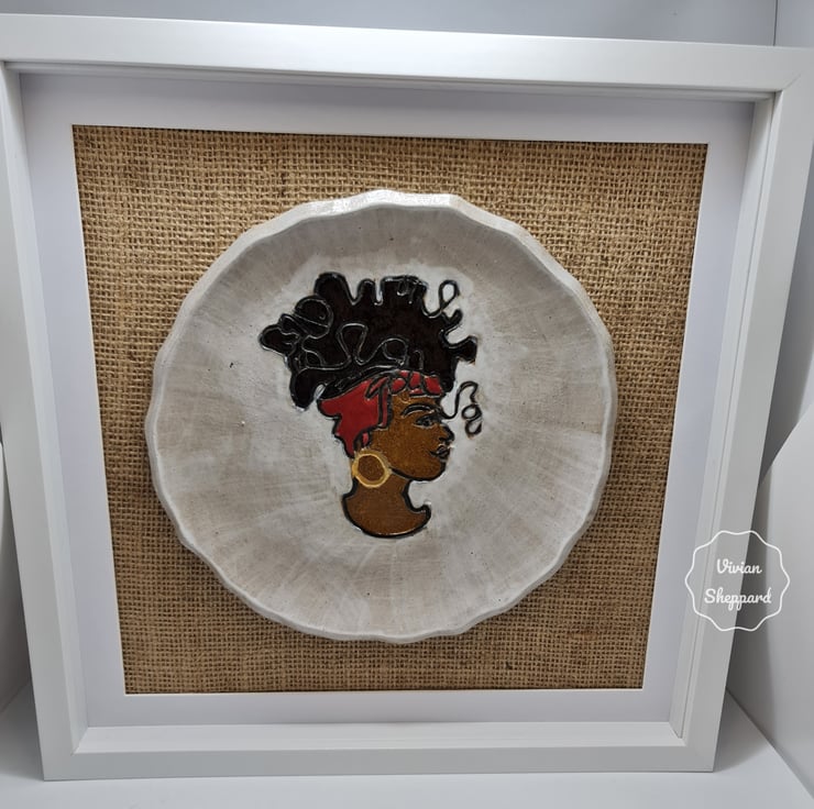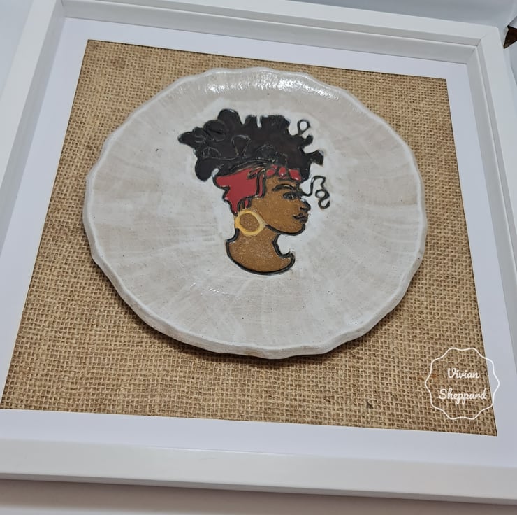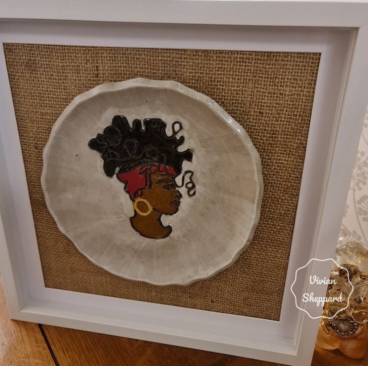 It features a profile of a woman wearing a headscarf, and it’s mounted on a hessian fabric background within a white frame.