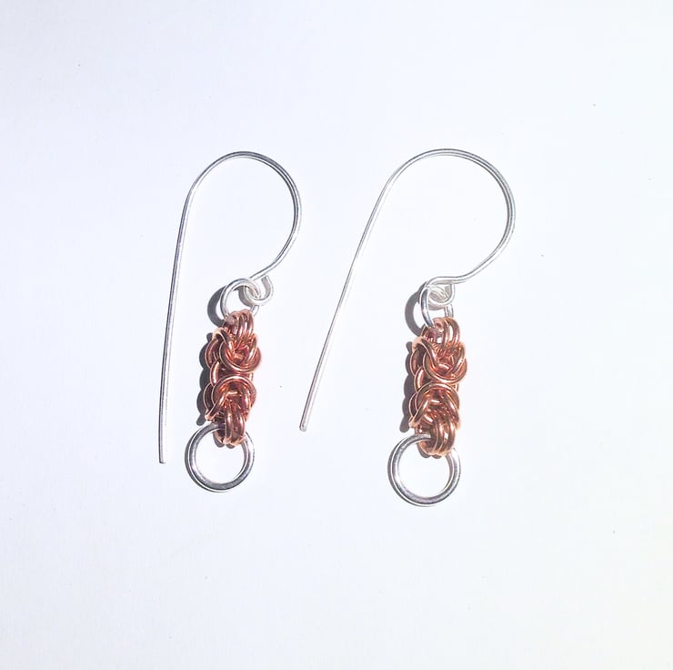 These lovely earrings have been crafted in a byzantine design from handmade copper jump rings and sterling silver jump rings.