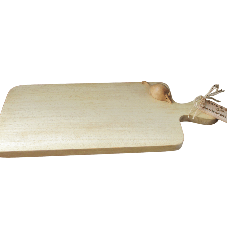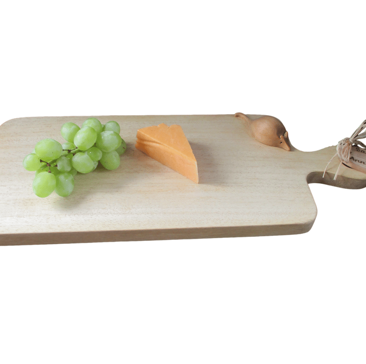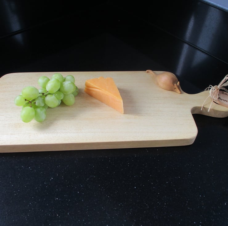 This wooden cheese board is handmade from solid hardwood. Each one is unique and slightly different due to the hand carved wooden mouse and the natural variation in the colour and grain of each board. The board is finely sanded and sealed with food safe coconut oil (wipe clean only).