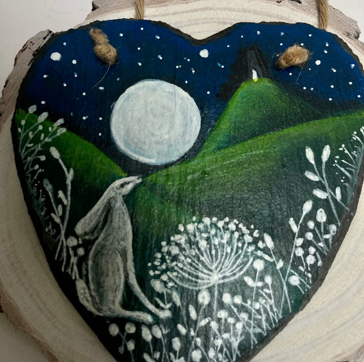 A heart shaped hanging slate decoration with a hand painted mystical scene of a white moon gazing hare looking up toward the full moon and glastonbury tor with foliage in the foreground