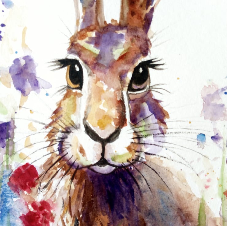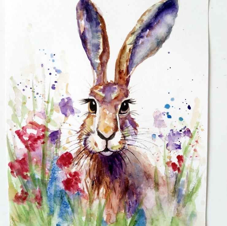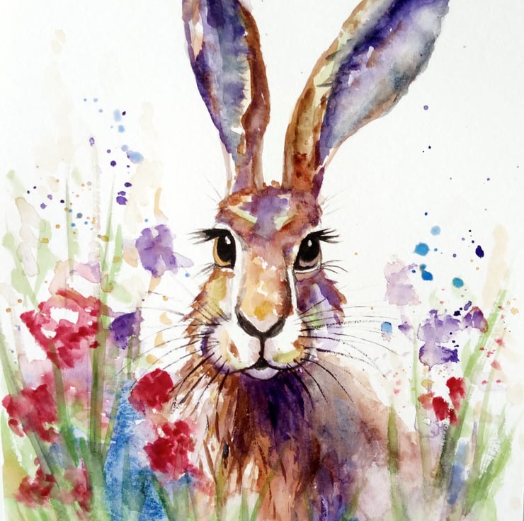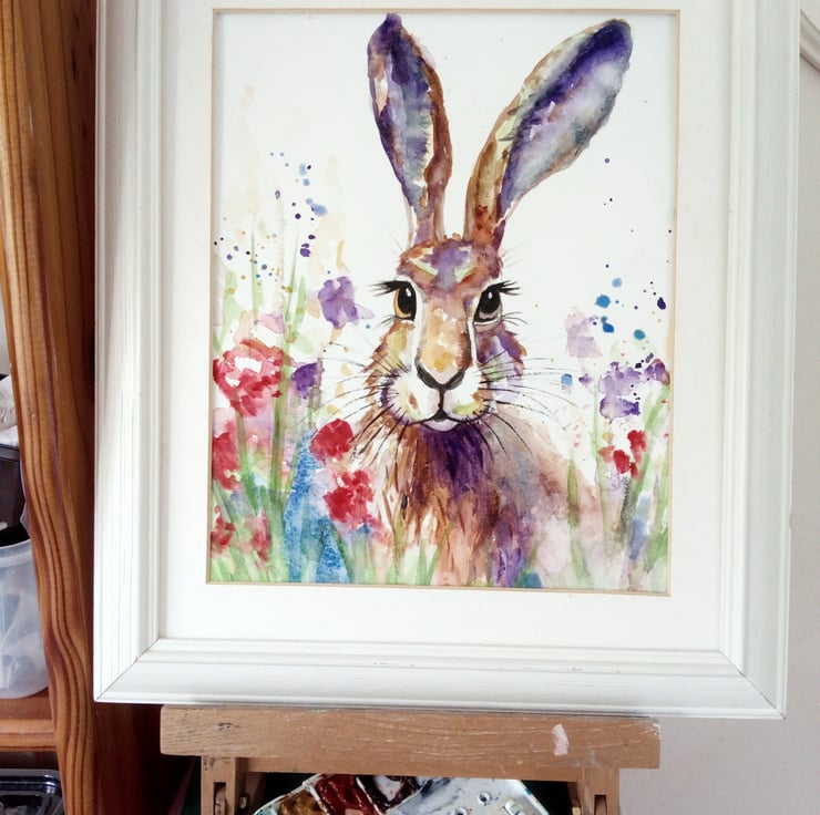 An original watercolor painting of a lovely hare sitting amongst grasses and flowers.