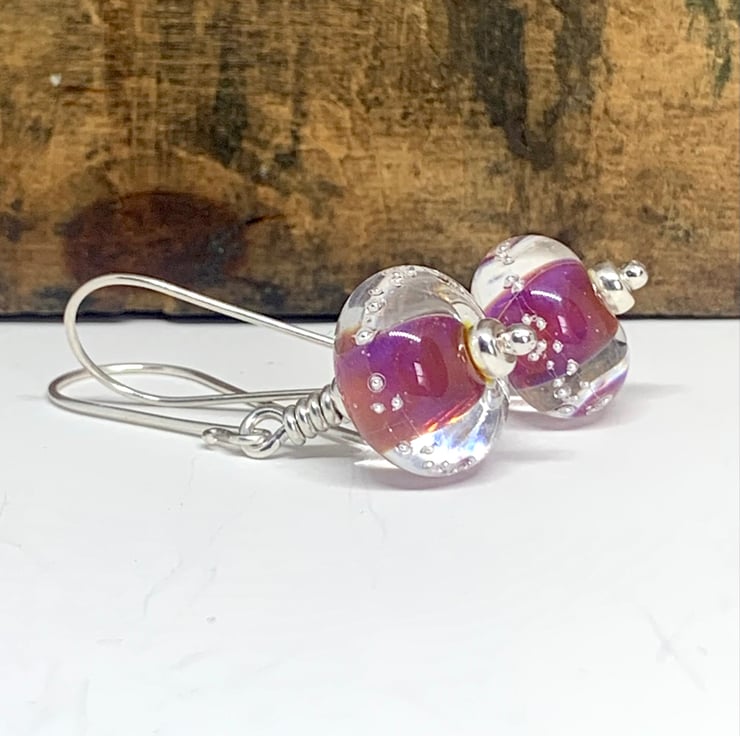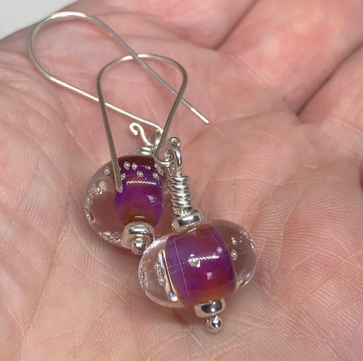 These stunning earrings have been handmade using specialist silver glass that has been heated in the flame to make the bead.