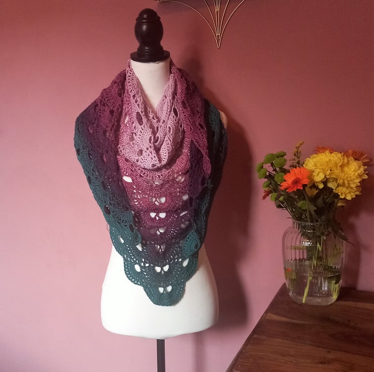 I was inspired by the beautiful yarn cakes available from Hobbii, I used one of the free Hobbii patterns to create this wrap.