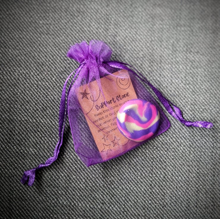 Support Stones are a fantastic tool for discreet fidgeting or a little extra bravery in your pocket. They are smooth 'stones' with a depression in the middle to rub with your thumb. Expel some nervous energy, calm yourself with the repetitive movement and smooth sensory input or use it as a reminder of the person who gave it to you.