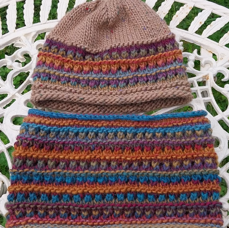 Both items incorporate an eyelet pattern design. The cowl is multicoloured throughout and the hat is a plain colour with the matching colourwave of the cowl as a decorative band.